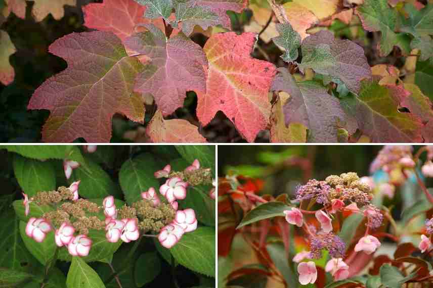 Hydrangea quercifolia , Hydrangea serrata ‘Kiyosumi’ (© Peganum); et Hydrangea aspera ‘Hot Chocolate’