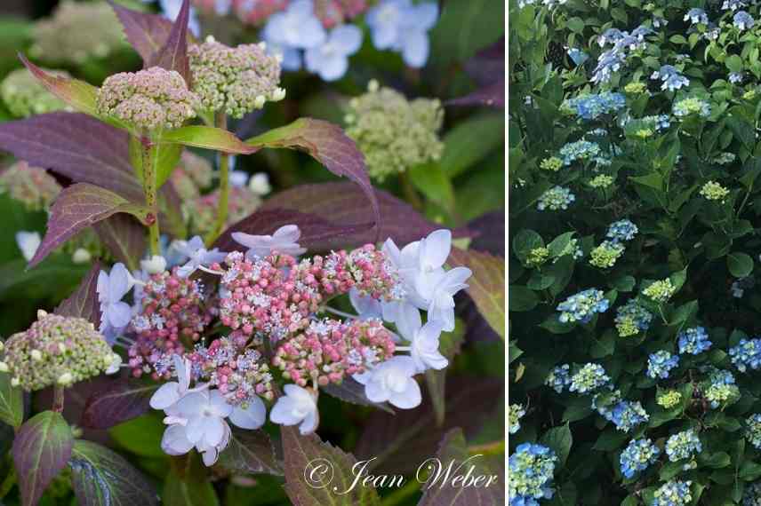 Hydrangea serrata ‘Tiara’ (© Jean Weber), et ‘Blue Bonnet’ (© Michele Dorsey Walfred)
