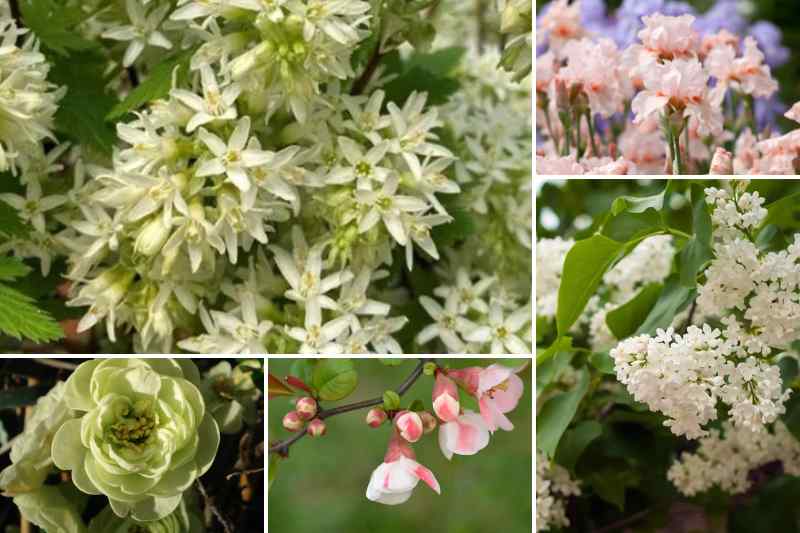 Invitez-le dans une scène radieuse et pleine de fraicheur, en jouant sur les tons blancs, verts et nacrés : ici en compagnie d'un Syringa vulgaris Comtesse D'harcourt, de cognassiers du Japon, et de petits Iris rosés, comme l'Iris pumila 'La Ballet', et 'Blushing Pink' pour une floraison plus tardive en été.