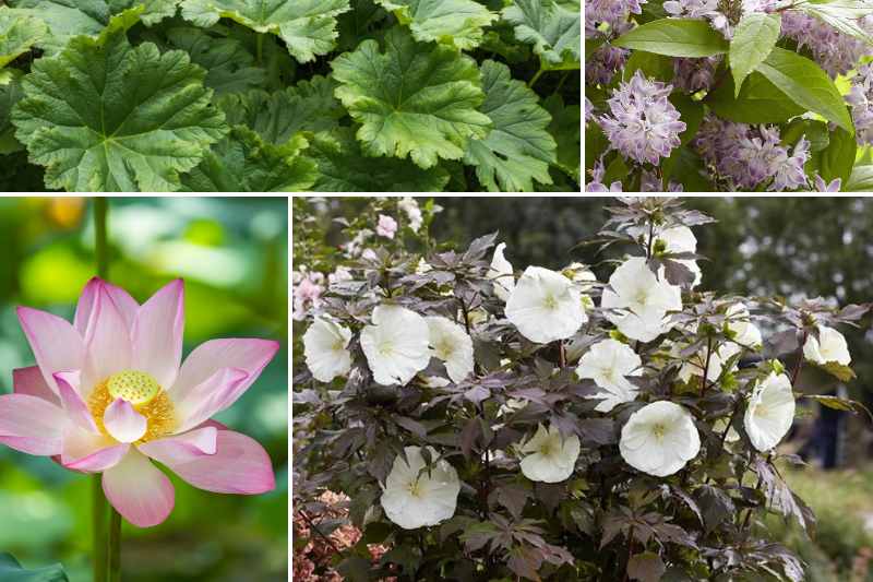 Notre idée d'association le montre ici sur une terrasse avec quatre beaux sujets fleuris ou à feuillage remarquable : un Deutzia compact romantique, un Darmera peltata (rhubarbe indienne) et un lotus pour l'accompagner tout l'été et accentuer son côté dépaysant !