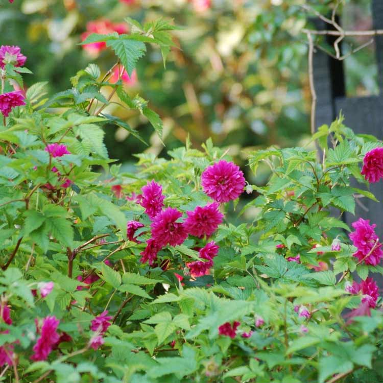 Et pour conclure en beauté, voici le Rubus Olympic Double ! Pas tout à fait nouveau, c’est mon coup de cœur pour la saison et l'une des plus belles ronces d’ornement que l'on puisse offrir à un jardin naturel ou à une haie champêtre. Vigoureux, drageonnant, cet arbuste nous offre des fleurs d’un rose-pourpré lumineux qui ressemblent à des roses miniatures en avril, puis des petites mûres assez insipides mais très appréciés des oiseaux. Cette plante aussi charmante que facile est à la portée de tous les jardiniers, même débutants ! Pour l’accompagner en massif ou dans une haie, pensez aux rosiers botaniques à fleurs d'églantier (Rosa moyesii, R. hugonis, R. rubrifolia…), sureaux (Black Lace), viorne boule de neige, lilas, chèvrefeuille arbustif Hack’s Red, ou encore à des fusains caducs.