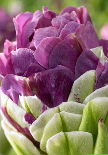 Véritable ovni dans le monde des tulipes, 'Exquisit' fait tout d'abord penser à… un artichaut ! Sa fleur, portée sur des tiges assez courtes (35 cm environ), évolue au fil des jours. Vert tendre à l'éclosion, ses pétales s'écartent pour dévoiler une couleur blanc ivoire puis former un dôme de pétales violet intense, joliment imbriqués les uns dans les autres. Rare et résolument originale, c'est une beauté particulière qui ne manquera pas d'attirer les regards, en massif ou en vase, à la maison.