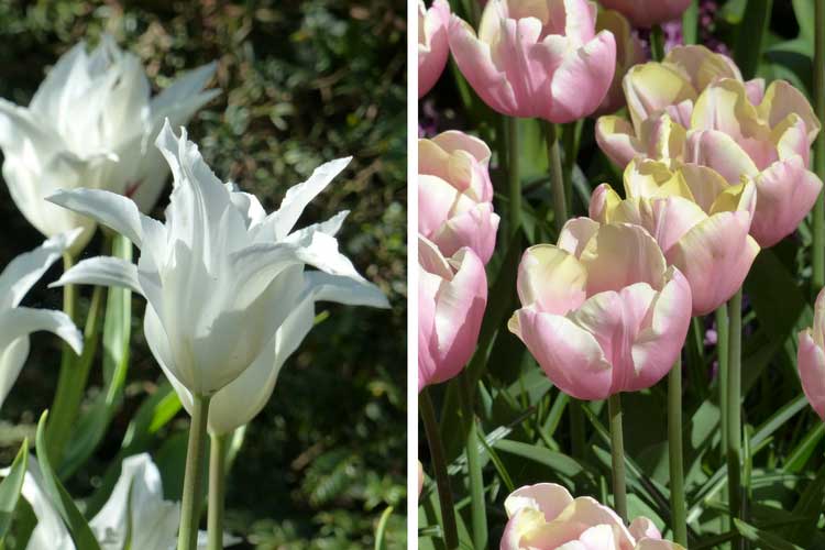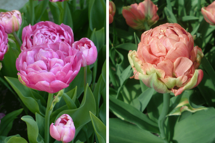 Enfin, car nous ne pouvions choisir, nous avons composé un duo avec ces deux merveilleuses tulipes à fleurs de pivoine. Hâtives, opulente et gracieuses, elles montrent des fleurs très doubles (12 cm) aux coloris exceptionnels : un rose soutenu, franc, mais délicat pour 'Amazing Grace' et un bois de rose cuivré vibrant 'Copper Image'. Portées sur des tiges solides, assez courtes (35 cm environ), ces deux tulipes fleurissent simultanément, en avril.