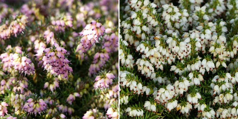 En faisant mon petit "tour de serre" quotidien, j'ai remarqué que les bruyères d'hiver (du genre Erica) étaient (déjà !) en fleurs depuis déjà plusieurs semaines... J'ai eu un coup de cœur pour deux variétés, nouvelles pour moi, de la série "Winter Belles" : leurs fleurs en clochettes sont deux fois plus grosses que la normale ! La variété 'Katia' arbore en plus un coloris blanc très pur tandis que 'Phoebe', d'un rose un peu saumoné, est en fleurs dès septembre... Vigoureuses et pas difficiles à faire pousser, ces sélections de Erica x darleyensis dont à découvrir absolument !