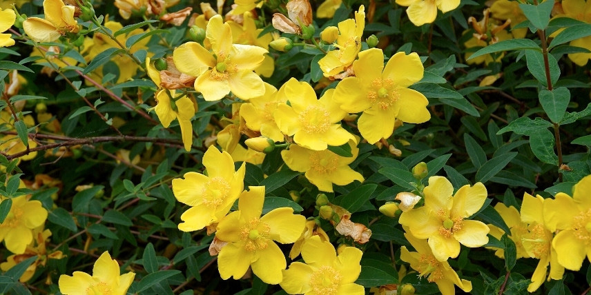Le Millepertuis est un arbuste inratable, qui trouvera sa place aussi bien en bordure de massif qu’en rocaille ou sur un talus. Il pousse rapidement, est bien rustique (jusqu’à – 15 °C) et s’adapte à tout type de sol bien drainé. Vous pouvez l’associer à d’autres floraisons lumineuses : achillée ‘Moonshine’, kniphofias, rudbeckias, hémérocalles… Vous pouvez jouer sur les couleurs complémentaires pour créer un massif très contrasté : ainsi, comme le violet est à l’opposé du jaune sur le cercle chromatique, n’hésitez pas à associer ces deux teintes, elles se renforceront mutuellement ! Pensez par exemple à la sauge Salvia nemorosa ‘Serenade’, au Perovskia atriplicifolia et au Penstemon ‘Midnight’.