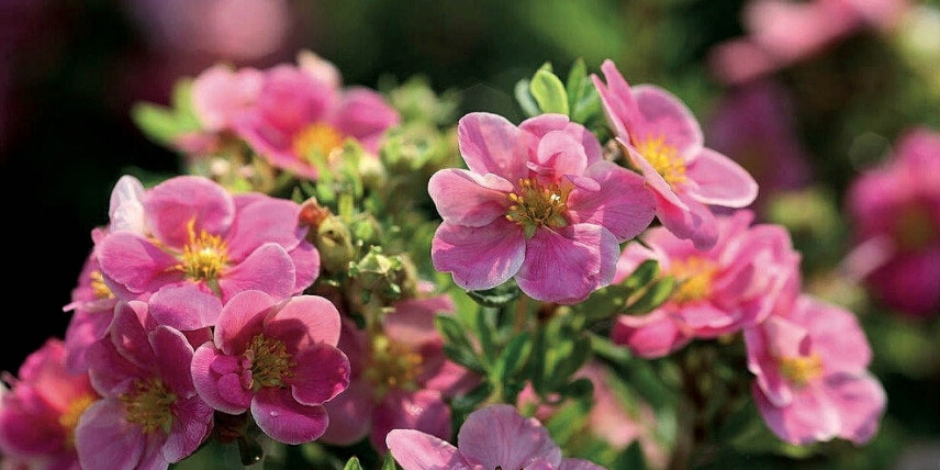 La Potentille forme un petit arbuste touffu, qui atteint entre 1 m et 1,50 m de hauteur, et qui porte de juin à septembre de ravissantes fleurs à cinq pétales, qui mesurent 2 à 5 cm de diamètre, aux teintes vives et lumineuses. Les fleurs peuvent être jaunes, roses, orange vif, blanches… La Potentille porte également un beau feuillage caduc, à la fois fin et dense.