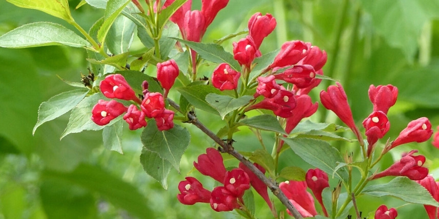 Les Weigelias fleurissent habituellement en mai-juin, cependant, ceux de la série ‘All Summer’ se distinguent par leur floraison très remontante, presque continue d’avril à septembre. Vous pouvez par exemple choisir le Weigelia ‘All Summer Red’, qui offre de belles fleurs en entonnoir de couleur rouge-rose vif. Ou le Weigelia ‘All Summer Peach’, dont les fleurs prennent un mélange de teintes rose, abricot et pêche. On apprécie ses teintes à la fois chaleureuses et délicates. Il existe aussi une variété panachée, un peu plus rare : ‘All Summer Monet’, à fleurs roses et feuilles vert foncé au centre marginées de blanc crème et rose. Vous pouvez aussi choisir le Weigela florida ‘Bristol Ruby’, qui fleurit de juin à septembre.