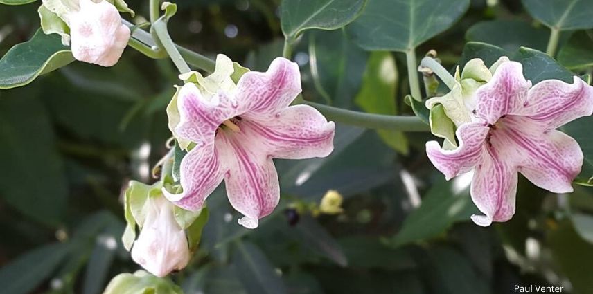 L’Araujia sericifera est une grimpante au feuillage vert glauque, légèrement duveteux au revers. De croissance rapide, ses tiges peuvent culminer à 5 m. Entre août et novembre, la plante produit des grappes de ravissantes fleurs en petites cloches rose pâle, aux veines plus foncées. La floraison parfumée est suivie de longues gousses qui renferment de nombreuses graines au fort pouvoir germinatif. Cette grimpante se décline également en blanc avec la variété ‘Alba‘. Sa sensibilité au froid (-5°C) la destine à être cultivée sous abri, et c’est d’ailleurs en serre ou véranda que nous vous conseillons de l’installer, car son nom de plante cruelle lui vient de sa faculté à piéger les pollinisateurs, en particulier les papillons.
