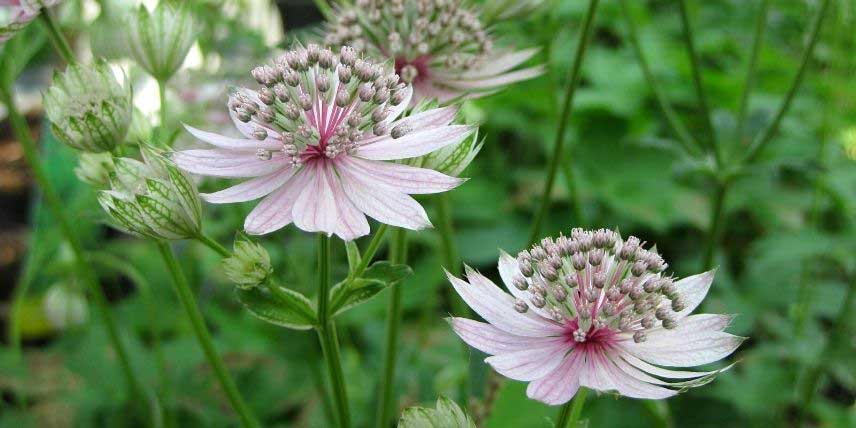 Les astrances offrent de splendides fleurs en ombelles étoilées, très délicates, qui peuvent être blanches ou rosées. Ces fleurs mesurent environ 3 cm de diamètre. Suivant les variétés, elles se déclinent dans de subtiles nuances, entre le rose foncé – pourpré, le blanc rosé très clair, et le blanc presque argenté ! Elles sont mellifères, et attirent ainsi les insectes pollinisateurs. Quant aux feuilles de l’astrance, elles ont une jolie forme palmée. C’est une plante rhizomateuse, qui pousse lentement, et elle met longtemps à s’installer. L’astrance est une plante de mi-ombre, qui apprécie les sols frais et fertiles, bien drainés. Elle a aussi l’avantage d’être tout à fait rustique et peu sensible aux maladies !