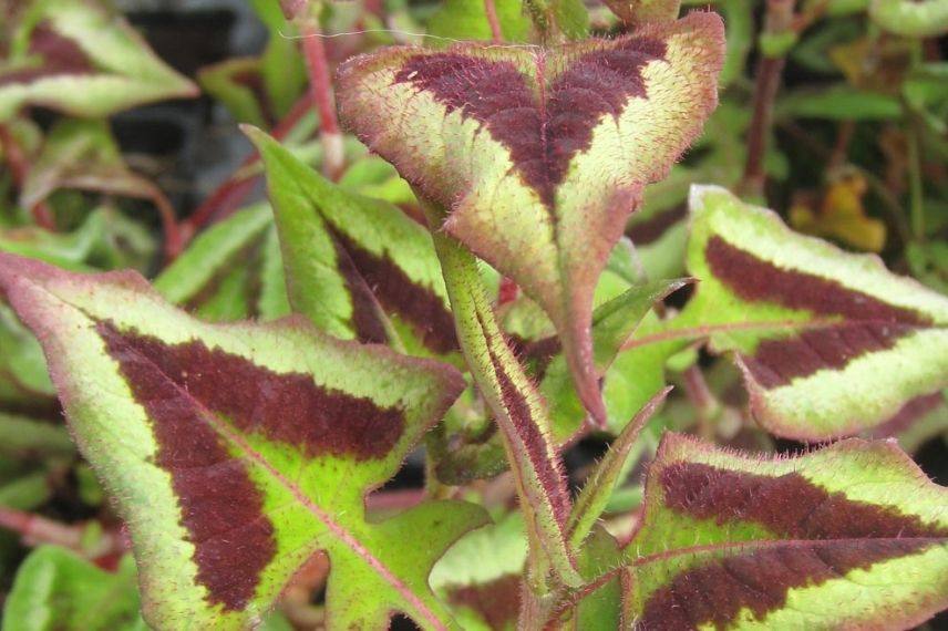 Les Persicaires sont appréciées pour leurs belles floraisons, mais certaines sont surtout cultivées pour leur feuillage décoratif. Ainsi, le feuillage triangulaire de Persicaria ‘Purple Fantasy’ décline différentes teintes en mélange. Au débourrement, le vert domine, en dégradés plus ou moins sombre. Le centre de chaque feuille est également orné d’un motif en forme de ‘V’, de couleur brune, et souligné d’argent. Plus tard en saison, les parties vert foncé de la feuille se teintent de pourpre. En été, de légers bouquets de petites fleurs blanches semblent virevolter au-dessus du feuillage. De croissance rapide, cette Renouée forme en quelques années un tapis de 50 cm de haut pour le double d’étalement, mais elle reste aisément sous contrôle. Facile à cultiver et rustique (-15°C, voire davantage), elle accepte toutes les expositions, en sol riche, frais, même lourd et humide. C’est également une bonne candidate pour végétaliser les zones un peu ingrates du jardin.