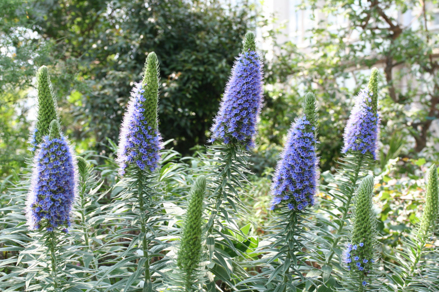 Echium candicans ou Vipérine de Madère est une vivace de la famille des Boraginacées, originaire de méditerranée à ne réserver donc qu’aux climats doux car elle ne résiste qu’à des températures de -2°C dans un sol bien drainé. D’allure exotique et très ornementale, elle forme en à peine trois saisons une touffe arbustive de près de trois mètres de large. Son beau feuillage velu de couleur vert-gris est soudain illuminé durant tout le printemps par de magnifiques épis bleus. Cette vivace, aussi étonnante que spectaculaire, apprécie la chaleur, le plein soleil en sols drainés à arides, et le bord de mer car elle s’accommode parfaitement des embruns. A noter qu’elle est aussi très mellifère et possède la faculté de produire continuellement du nectar. Le miel d’Echium est très recherché pour son parfum doux et floral.