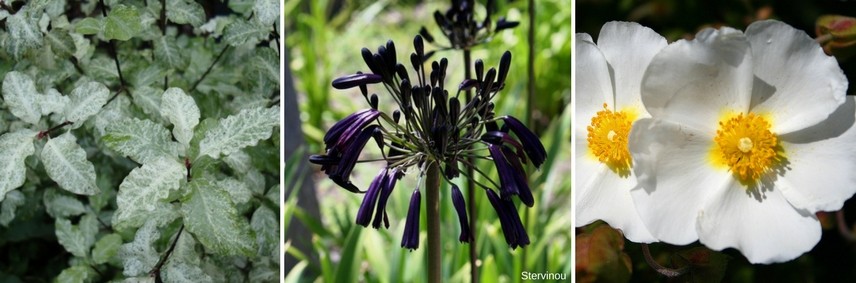 Une idée d’association contrastée : Mariez des Pittosporum tenuifolium ‘Irene Patterson’ et des Agapanthes ‘Black Magic’. Ajoutez quelques Cistus monspeliensis qui fleuriront avant le temps des agapanthes.