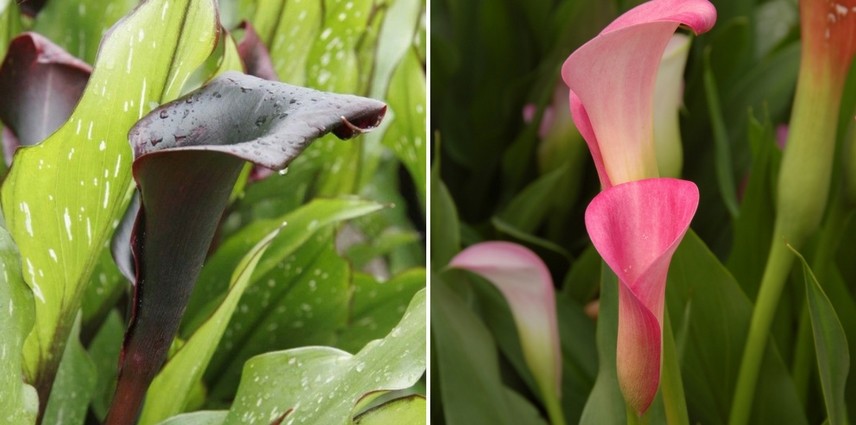 L’arum ou calla noir présente des fleurs pourpres violacées très foncées en été. Son feuillage moucheté de blanc est très décoratif. Il peut être cultivé en pleine terre (humide) mais sa petite taille (40cm) le prédispose à la culture en pot en veillant bien à l’arrosage. Ils peuvent être utilisés dans la confection de bouquets.