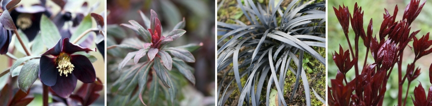 Une idée d’association ton sur ton : Helleborus orientale ‘Black Chocolate’, feuillage d’Euphorbia amygdaloïdes ‘Purpurea’, Ophiopogon planiscapus ‘Nigrescens’, jeunes pousses de pivoine Paeonia suffruticosa ‘Black Beauty’ (Photos de Virginie Douce, sauf l’hellébore).