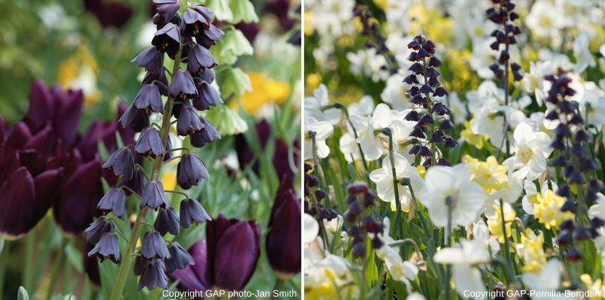 En avril-mai, la fritillaire ‘Adiyaman’ dresse de solides hampes florales majestueuses au coeur d’un beau feuillage glauque. Ses clochettes sont d’un pourpre profond presque noir. Veillez à la planter au soleil. Elle permet d’apporter un peu de verticalité dans vos massifs printaniers, parmi des tulipes ou des narcisses.