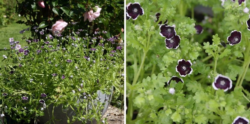 Les némophiles sont de jolies annuelles tapissantes aux petites fleurs, pourpre violacé presque noir pour la variété ‘Pennie Black’. Elle peut être plantée en avant-plan de massif mi-ombragé qu’elle égaiera tout l’été. La terre doit rester fraîche. Si vous désirez l’associer, optez pour des Corydalis qui apprécient les mêmes conditions de culture. Elle est également ravissante cultivée seule dans un pot en forme de coupe. Le feuillage vert clair dentelé est aussi très décoratif.