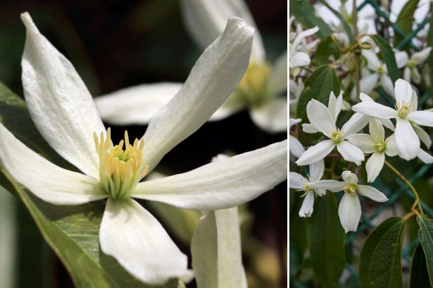Sa floraison est une véritable nuée de petites fleurs très légères à 4 sépales d’un blanc pur, chaque fleur mesurant environ 5 cm. Elles sont groupées en panicules terminales, recouvrant de leur blancheur le manteau vert que forme l’abondant feuillage allongé vert foncé vernissé. Le port de cette clématite est vraiment magnifique et dégage un charme absolu.