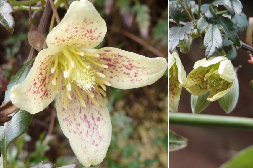 La clématite cirrhosa balearica, également appelée clématite de Noël, fait partie des clématites dites « cireuses » qui ont la particularité de fleurir tôt en hiver. Ses inflorescence sous forme d’originales et gracieuses clochettes pendantes, crème à jaune pâle, éclaboussées de pourpre à l’intérieur de la corolle s’épanouissent à partir du mois d’octobre, et se renouvellent jusqu’en février. D’origine méditerranéenne (elle a été découverte aux îles Baléares), elle résiste pourtant bien aux froids jusqu’à -15° en exposition plein soleil, abritée des vents et en sol drainé. Elle est légèrement parfumée.