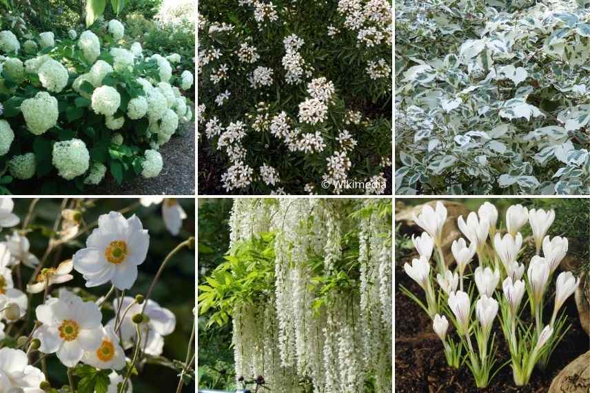 Pour compléter, le jardin blanc intégrera des plantes vivaces comme le Cierge d’argent Actaea simplex ‘Atropurpurea’, qui offre en septembre-octobre de beaux épis garnis de petites fleurs en étoiles blanc pur, ou encore des Anémones du Japon blanches à cœur jaune contrastant.
