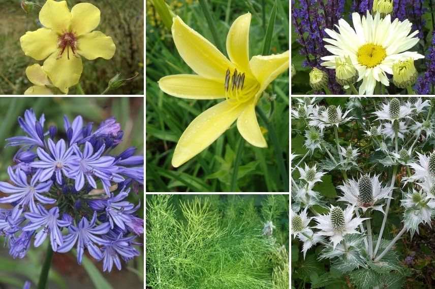 Hemerocallis citrina, Leucanthemum ‘Banana Cream’, Eryngium giganteum, Fenouil, Agapanthe ‘Northern Star’, Verbascum ‘Gainsborough’