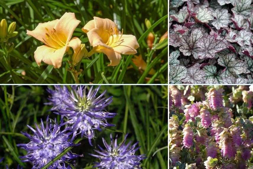 Hemerocallis ‘Mini Stella’, Phyteuma scheuchzeri, Origanum rotundifolium ‘Kent Beauty’, Heuchera ‘Prince of Silver’