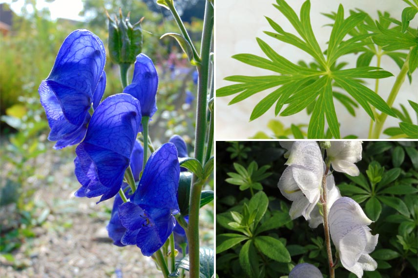 Aconitum napellus (floraison bleue), détail de la feuille et Aconitum Stainless Steel (fleur claire).