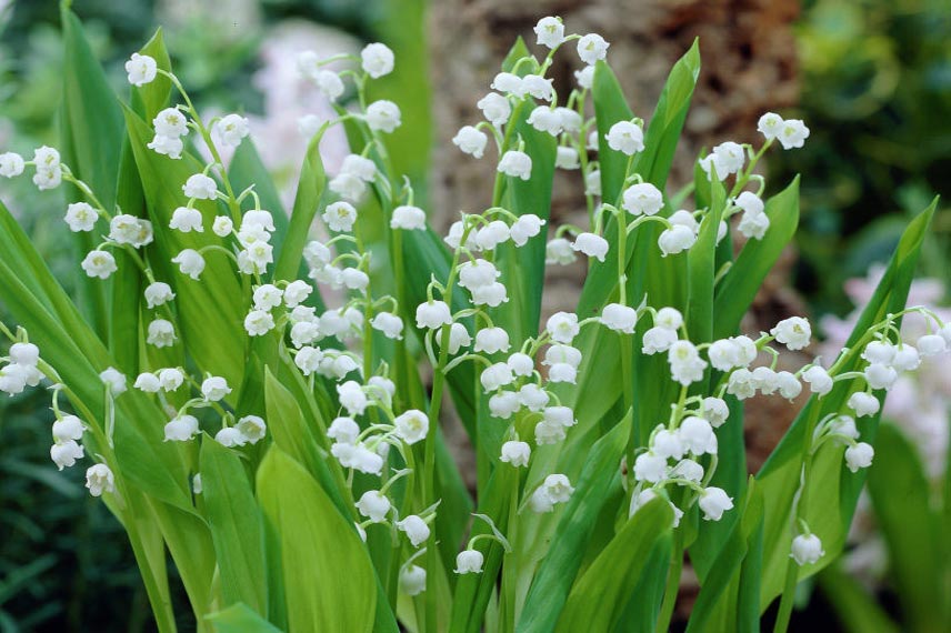Cette plante de sous-bois s’épanouit à l’ombre ou à la mi-ombre dans un sol frais et riche en humus, souple et léger. Cette vivace tapissante offre des petites fleurs en forme de clochettes, dégageant un parfum subtil. Elle s’organise en petites touffes n’excédant pas le 20cm de haut. Le Convallaria compte des feuilles ovales et dressées, situées autour de la base de la tige. Leur vert franc dénote du blanc des petits grelots. Le muguet authentique de nos sous-bois, le Convallaria majalis a une floraison blanche, mais il existe une variété aux fleurs roses : Convallaria majalis ‘Rosea’. Quelque soit la variété choisie, le muguet est rustique, il tolère jusqu’à -15°C.