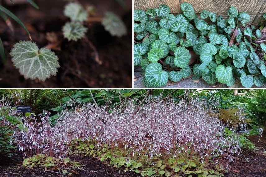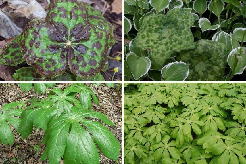 Podophyllum hexandrum, Podophyllum ‘Spotty Dotty’, et en bas Podophyllum peltatum
