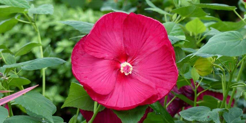 L’hibiscus des marais offre de très grandes fleurs constituées de cinq pétales, qui se déclinent dans des teintes de rose, voire rouge, suivant les variétés. Elles sont bien arrondies, de forme régulière, et atteignent jusqu’à 25 cm de diamètre. Nous vous conseillons en particulier la variété ‘Pink Passion’, qui offre de belles fleurs rose vif. On apprécie également son feuillage découpé, de couleur pourpre foncé. Il s’agit d’une grande vivace, dont les parties aériennes disparaissent en hiver, puis elle redémarre de la souche au printemps. Comme son nom l’indique, l’hibiscus des marais a besoin d’un sol qui reste humide du printemps à l’automne. En hiver, mieux vaut que le sol reste frais, sans être détrempé. Découvrez aussi le superbe Hibiscus coccineus, aux conditions de culture similaires, qui offre de grandes fleurs rouge vif !