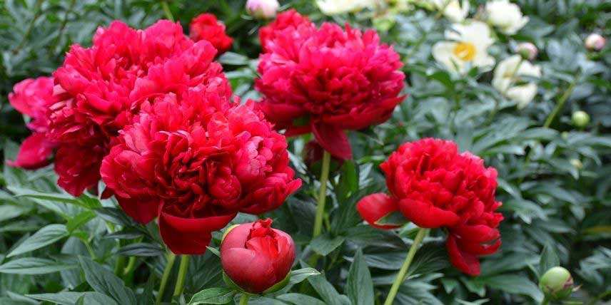 La pivoine lactiflora ‘Henry Bockstoce’ offre en mai-juin de grandes fleurs semi-doubles, rouge vif, qui mesurent 16 à 20 cm de diamètre. C’est l’une des plus belles pivoines à fleurs rouges ! On apprécie sa teinte éclatante. Les fleurs sont portées par des tiges solides, qui supportent leur poids sans nécessiter de tuteurage. Découvrez aussi la pivoine ‘Sea Shell’, qui donne de grandes fleurs simples, formées de pétales rose tendre bien ouverts, dévoilant au centre des étamines jaunes. Plantez ces pivoines au soleil ou à mi-ombre dans une bonne terre de jardin, qui reste plutôt fraiche.