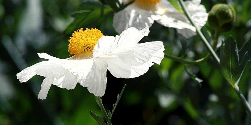 Les fleurs du Romneya coulteri ressemblent à de grandes fleurs de pavot blanches – ce qui lui vaut son surnom de Pavot en arbre. Elles atteignent entre 15 et 20 cm de diamètre et sont agréablement parfumées. Elles sont constituées de six pétales blancs très légers, à l’aspect froissé, entourant un centre d’étamines jaunes dorées. Le Romneya est une vivace géante, qui peut atteindre jusqu’à 1,50 m de hauteur ! Elle est un peu délicate à cultiver, et sera particulièrement à son aise dans la moitié sud de la France, notamment en région méditerranéenne. Au jardin elle a besoin d’un emplacement chaud et ensoleillé, et se plait en terrain drainant, plutôt sec, pauvre et caillouteux. Elle est rustique jusqu’à – 10 °C et redoute l’excès d’humidité.