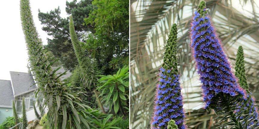 La Vipérine des Canaries, ou Echium pininana, est également une plante gigantesque et impressionnante, qui atteint jusqu’à 3 mètres de haut lorsqu’elle est en fleurs. On apprécie son style très exotique ! Elle donne en été de grands épis floraux coniques, très longs, constitués de fleurs violettes parmi lesquels émergent des feuilles vertes très fines. C’est une plante qui a besoin de chaleur. Elle n’est pas très rustique, et sa culture est à réserver aux régions où les risques de gel sont très faibles (pourtour méditerranéen, littoral atlantique…). Placez-la en plein soleil, dans un terrain drainant, plutôt sec.