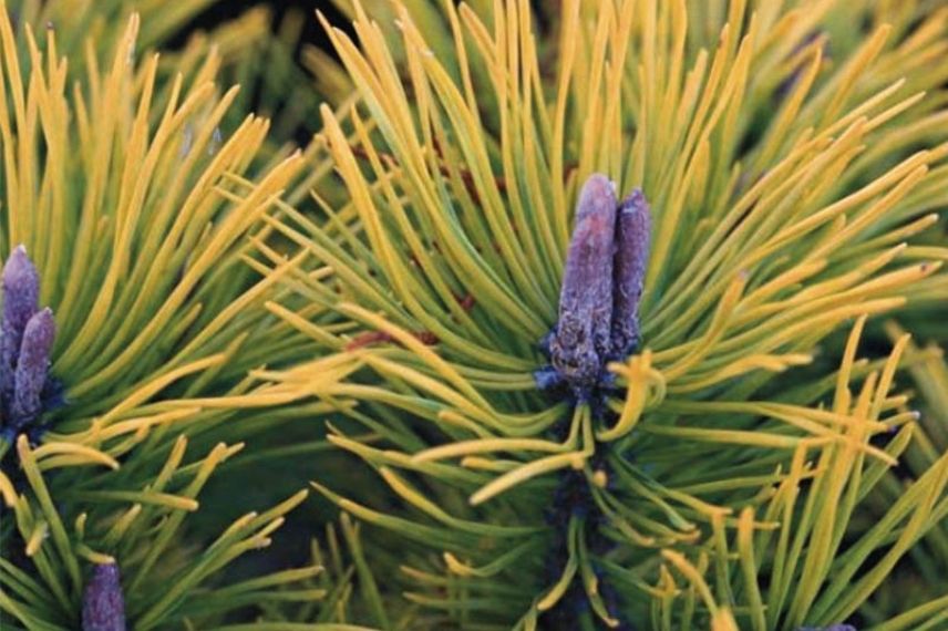 Également appelé « le pin des montagnes », le Pinus mugo ‘Golden Glow’ arbore un feuillage doré persistant, extrêmement lumineux, notamment en automne et au printemps : émergeant de bourgeons brun clair, ses jeunes pousses sont de couleur jaune d’or, avant de virer au vert vif et clair, le reste de l’année. Enfin, ses chatons se distinguent nettement, dans ce feuillage coloré, avec leur couleur prune.