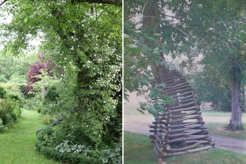 Un rosier à l’assaut de grands arbres du jardin, et une structure en bois originale permettant de faire courir n’importe quelle grimpante