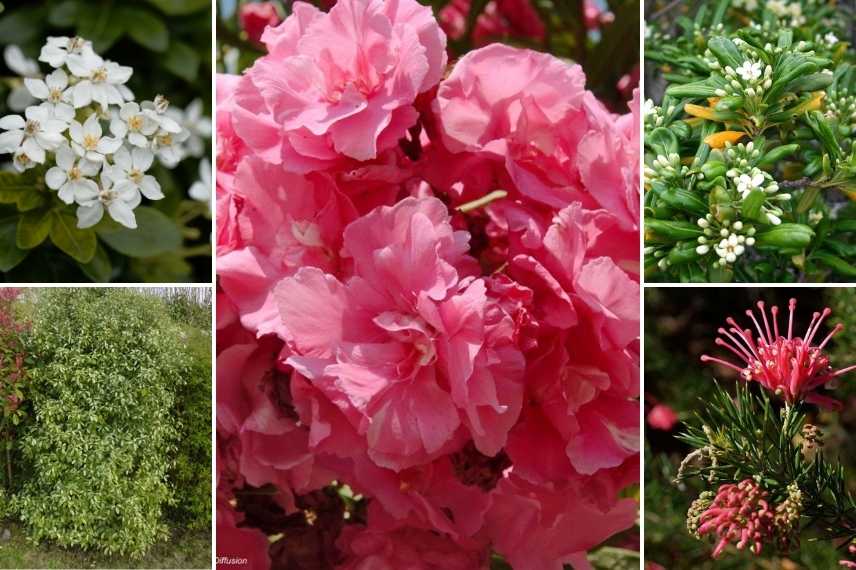 Nerium oleander ‘Rose Double’, Oranger du Mexique, Pittosporum tenuifolium ‘Variegatum’, Pittosporum tobira, Grevillea juniperina