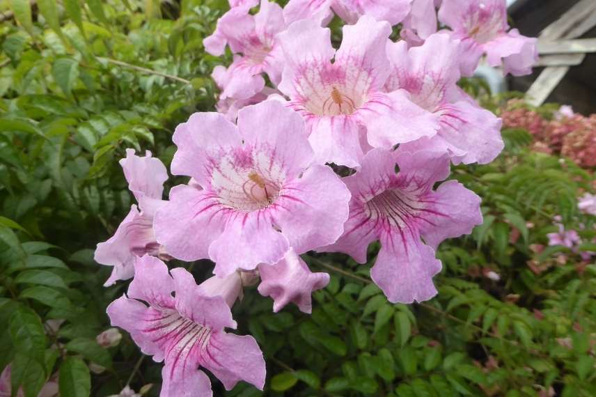 Le Podranea ricasoliana, aussi appelée Bignone rose, est un arbuste grimpant de la famille des bignoniacées, dont les fleurs ressemblent à s’y méprendre à la véritable bignone (Campsis). Cet arbuste rose est absolument magique palissé le long d’un mur ou d’une tonnelle en plein soleil, la cascade de fleurs en trompette roses striées de rouge attirant tous les regards. Tout comme sa cousine la bignone, elle produira après floraison, des fruits en forme de gousse, plutôt décoratifs.
