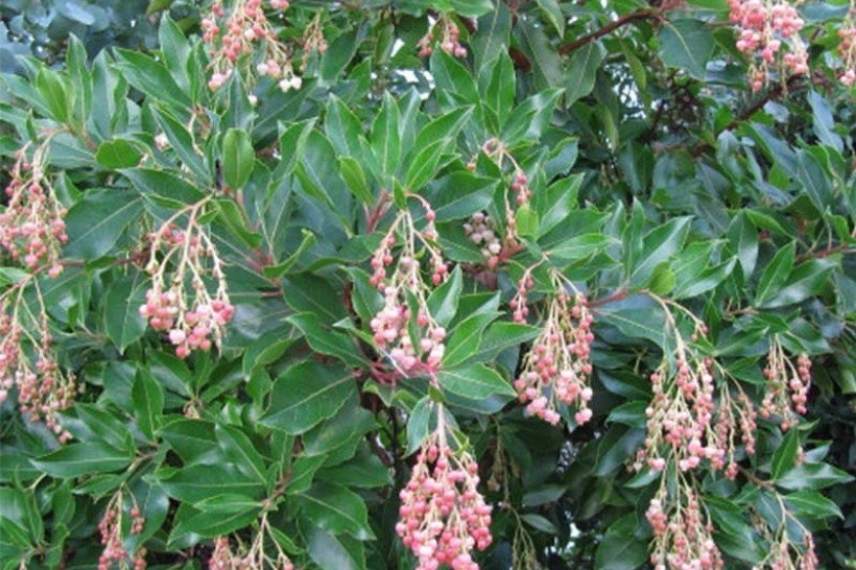 L’arbutus unedo, arbousier ou arbre à fraises, est un arbuste persistant très intéressant en automne, où il commence une floraison remarquable en forme de petites clochettes. On le reconnait bien comme faisant partie de la famille des ericacées par cette floraison singulière, tels des petits grelots renflés et retombants, groupés en forme de grappes. L’Arbutus unedo ‘Rubra’ se distingue par la couleur de ses petites fleurs, d’un joli rose soutenu. Il fleurit entre les mois de septembre et octobre, s’avère également mellifère et nectarifère à une période de l’année où les butineurs ont un garde-manger plus réduit ! Un peu plus compact que l’espèce type (3 m en tous sens), il arbore un port buissonnant, un feuillage dense et coriace, et dévoile une très belle écorce rougeâtre sur un tronc court. L’arbutus unedo est considéré comme arbuste de climat doux, mais le cultivar ‘Rubra’ est un peu plus rustique, jusqu’à -15°C, ce qui en fait un arbuste de choix à planter dans bien des régions. Plantez-le en situation ensoleillée, ou à mi-ombre, en terre drainée, en sol sec ou frais. Vous pourrez même le planter en terrain calcaire. Autre avantage non négligeable, ce petit arbre à fraises se couvre de fruits globuleux rouges, très décoratifs, qui tombent avant la floraison, ou perdurent en même temps.