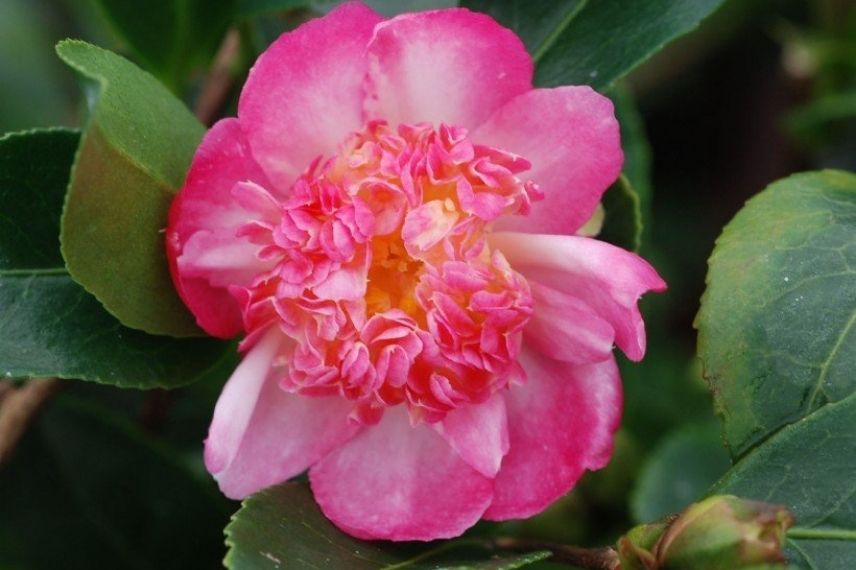 Le Camélia sasanqua ‘Choji Guruma’ est un très bel arbuste d’environ 1,50 à maturité, possédant un port irrégulier. De septembre à novembre, il se couvre de ravissantes fleurs doubles en forme d’anémone, avec un coeur de pétales chiffonnés. Leur coloris rose clair se margine de rose plus foncé sur les bords. Sa floraison est en outre légèrement parfumée. Ses feuilles sont brillantes et coriaces, légèrement dentelées. Il exige un sol frais, pourra être planté idéalement à mi-ombre, mais supporte une ombre plus franche et une exposition ensoleillée. Le camélia ‘Choji Guruma’ croit de façon assez lente, comme tous les camélias. S’il s’épanouit pleinement en massif arbustif, en compagnie d’autres camélias à floraison printanière, associé à des rhododendrons, des Hydrangeas ou des Hamamélis, ses faibles dimensions à maturité le prédisposent également à une plantation en bac sur une terrasse (il est rustique jusqu’à -10°C). En pleine terre, essayez un petit tapis de cyclamens de Naples pour accompagner sa belle floraison.