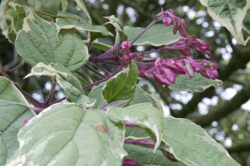 Le Clerodendrum trichotomum ‘Variegatum’ a la particularité d’avoir un superbe feuillage panaché de vert et de jaune, duveteux. Les feuilles amples et nervurées se teintent de blanc avec le temps, ce qui rend l’arbuste particulièrement évolutif, et attrayant avant même sa floraison.