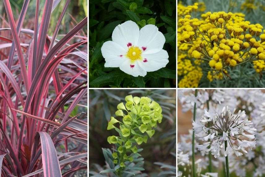 Association entre la Cordyline, le ciste, l’Agapanthe Midnigth Blue, l’Euphorbia characias et l’immortelle d’Italie