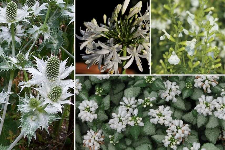 Ensuite, associez quelques touffes d’Agapanthes africanus Albus en alternance avec des sauges à la floraison délicate comme celle de la Salvia greggii Alba. Ajoutez un lamier blanc en couvre-sol et quelques panicauts au feuillage argenté en été.