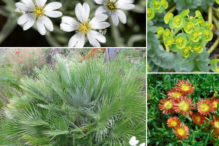 Il est aussi possible d’imaginer un paysage d’allure quelque peu mexicaine avec des palmiers nains, des euphorbia myrsinites et des vivaces qui apprécient les conditions les plus sèches : corbeille d’or, céraiste, armeria, arabis, sedum, delosperma, etc.