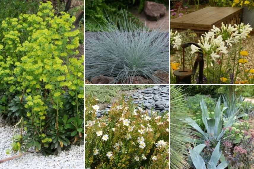 Quelques exemples de plantes pour un jardin de gravier : Euphorbes, graminées comme la fétuque par exemple, Agapanthes et Achillées, Cistes, Agave et Sedum