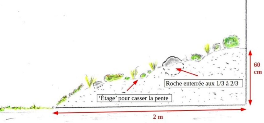- Afin de copier au plus près la Nature, il est impératif de travailler sur un terrain qui offre un minimum de dénivelé. Ainsi, l’eau s’écoule vers le bas de votre ‘talus’ et les plantes ne pataugent jamais. Si votre terrain est déjà en pente, profitez-en ! Dans le cas contraire, créez une pente artificielle en formant une butte. Cela peut être fait en réservant à cet usage une partie de la terre extraite lors de la construction d’une maison. Sur un terrain existant, vous pouvez toujours vous faire livrer de la terre végétale. Rassurez-vous, il n’est pas nécessaire de créer un Everest chez vous ! Un dénivelé global équivalent à 60 cm tous les 2 mètres est largement suffisant. Si la pente est plus importante, ce n’est pas un problème, à condition de bien stabiliser l’ensemble avec les roches. Plutôt que de façonner une pente régulière, essayez plutôt de créer des étages et des décrochages, avec certaines parties qui remontent un peu de temps en temps, comme c’est le cas en milieu naturel.