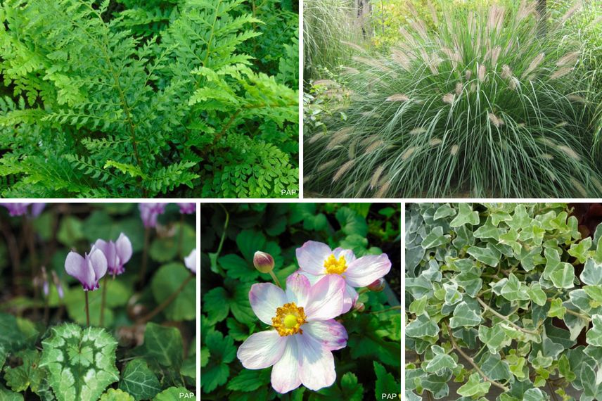 Un exemple d’association dans un grand pot : Polystichum setiferum ‘Proliferum’, Pennisetum alopecuroides ‘Gelbstiel’, Cyclamen hederifolium, Anemone japonica ‘Fantasy Cinderella’ et Hedera helix ‘Mini Ester’ cascadant par dessus le pot.