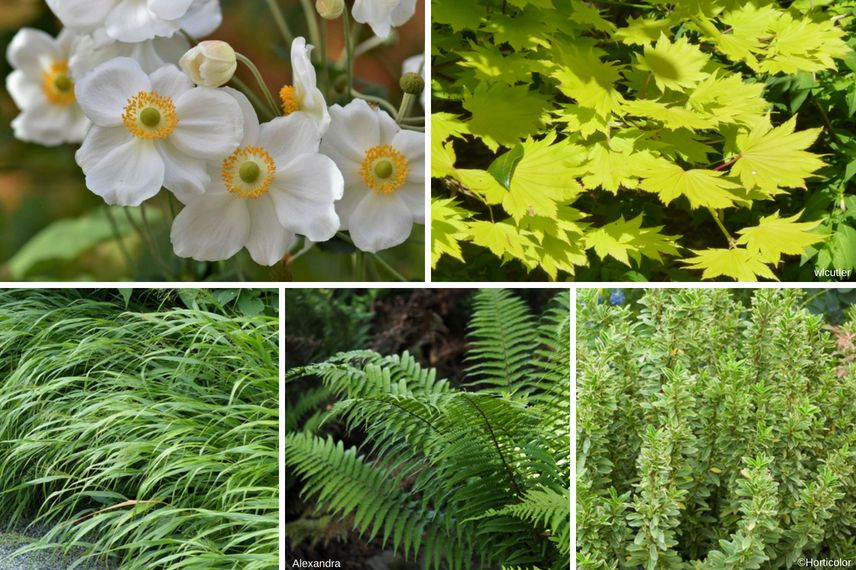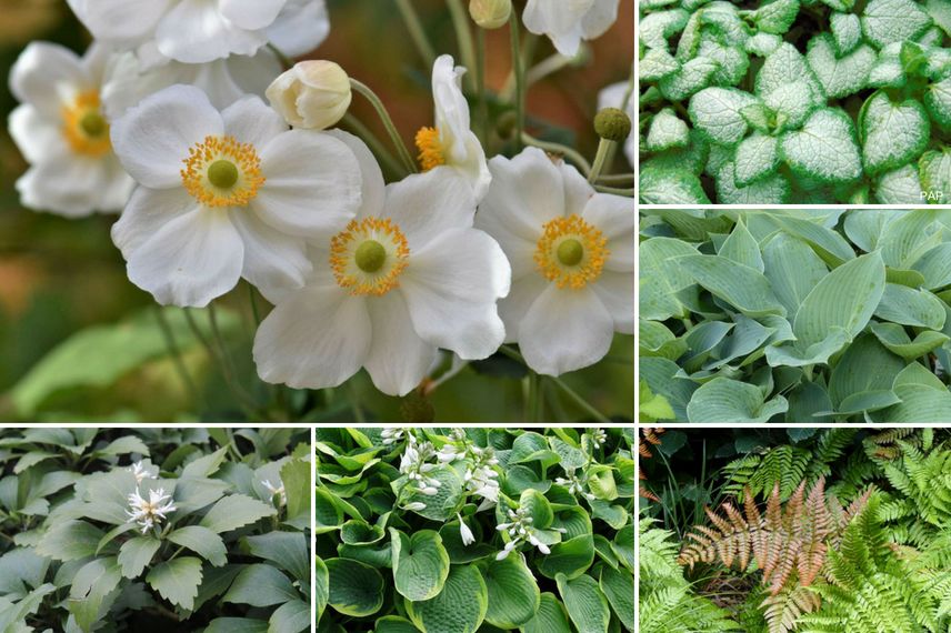 Un exemple d’association avec des feuillages : Anemone japonica ‘Honorine Jobert’, Lamium maculatum ‘White Nancy’, Hosta tardiana ‘Halcyon’, Dryoteris erythrosora, Hosta sieboldiana ‘Frances Williams’, Pachysandra terminalis.