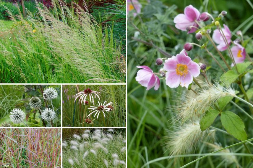 Une idée d’association avec des graminées : Anemone japonica ‘September Charm’, Pennisetum villosum, Deschampsia cespitosa ‘Goldschleier’, Echinops sphaerocephalus ‘Arctic Glow’, Echinacea pallida ‘Hula Dancer’, Miscanthus sinensis ‘Dronning Ingrid’.