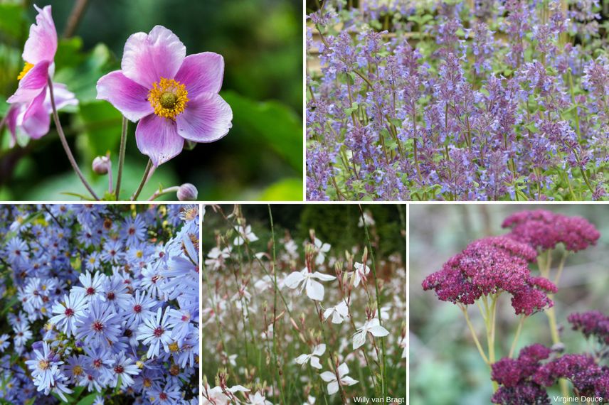 Une idée d’association en mixed-borders : Anemone japonica ‘Rosenschale’, Nepeta faassenii ‘Six Hill’s Giant’, Aster cordifolius ‘Little Carlow’, Gaura lindheirmeri ‘Blanche’, Sedum spectabilis ‘Herbstfreude’.