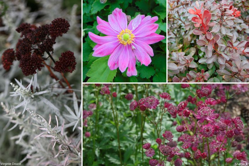 Une idée d’association aux nuances roses, pourpres et argentées : Anemone japonica ‘Prinz Heinrich’, Berberis thunbergii ‘Atropurpurea Nana’, Astrantia major ‘Lars’, Sedum ‘Jose Aubergine’ et Artemisia ludoviciana ‘Silver Queen’.