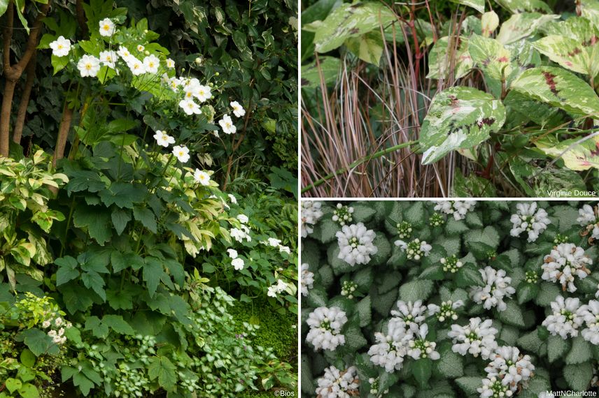 Un exemple d’association à mi-ombre : Anemone japonica ‘Dreaming Swan’, Persicaria virginiana ‘Painter’s Palette’, Lamium maculatum ‘White Nancy’, sous le couvert d’un Fatsia japonica.